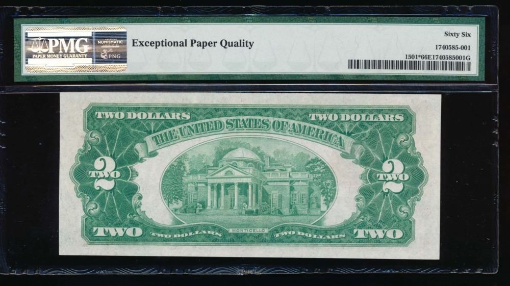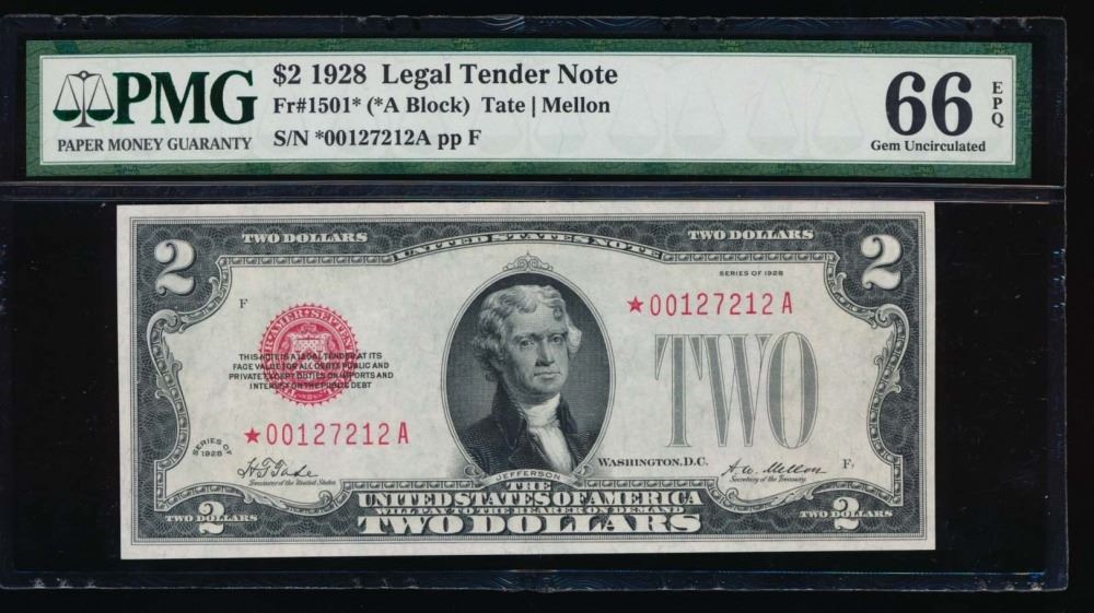 One 1928 $2 Legal Tender Star Note PMG 66EPQ.