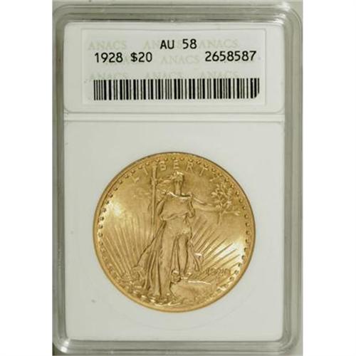 <B>1928 $20 AU58 ANACS.</B></I> NGC Census: (127/37213). PCGS Population (567/35844). Mintage: 8,816,000. Numismedia Wsl. Price for NGC/PCGS coin in AU58: $686. (#9189)<BR><BR><B>Coin Engraver:</B> Augustus Saint-Gaudens<BR><BR><b>Shipping:</b> Coins & Currency (<a target="_blank" href="http://www.heritageauctions.com/common/shipping.php">view shipping information</a>\)