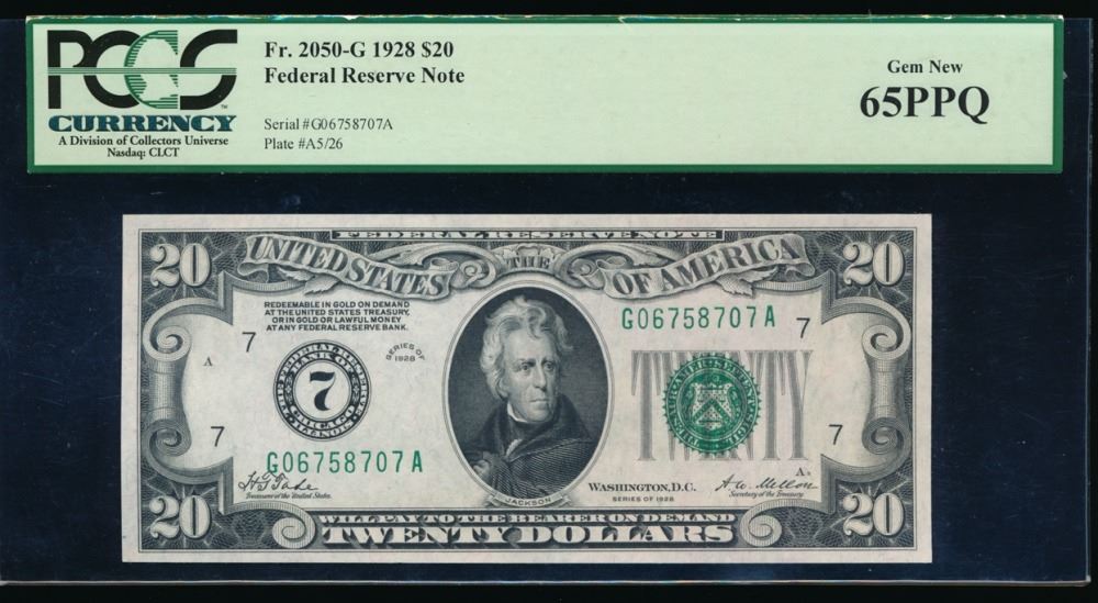 One 1928 $20 Chicago Federal Reserve Note PCGS 65PPQ.