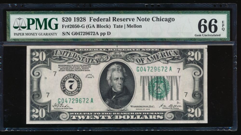 One 1928 $20 Chicago Federal Reserve Note PMG 66EPQ.