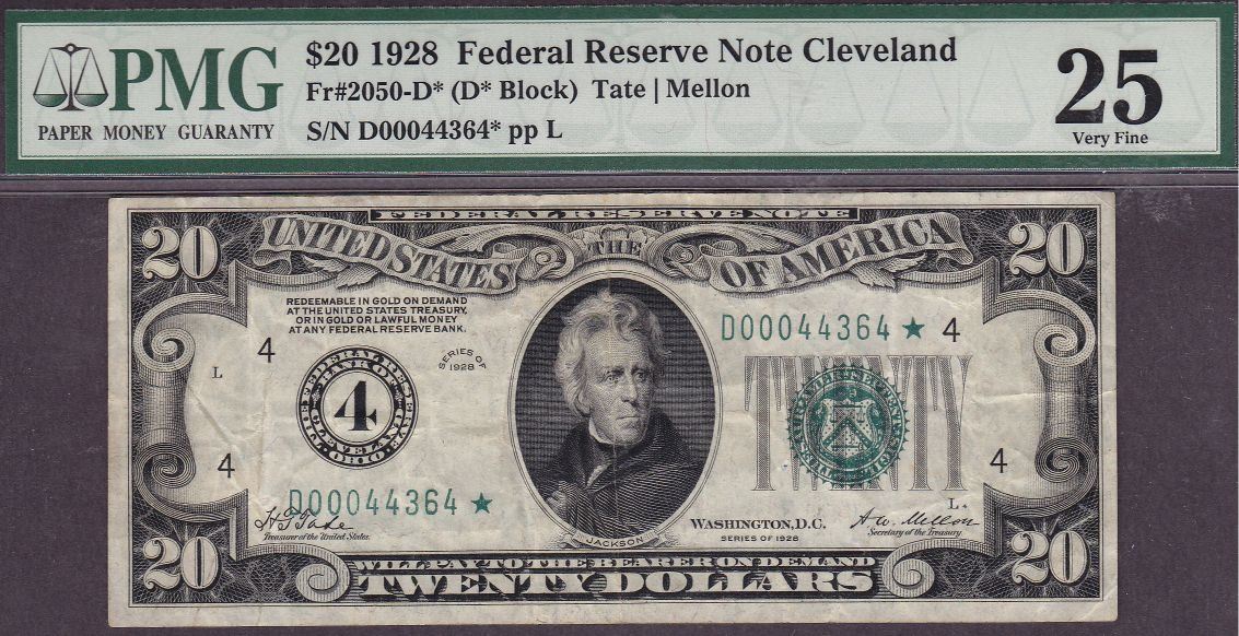 One 1928 $20 Cleveland Federal Reserve Star Note PMG 25.