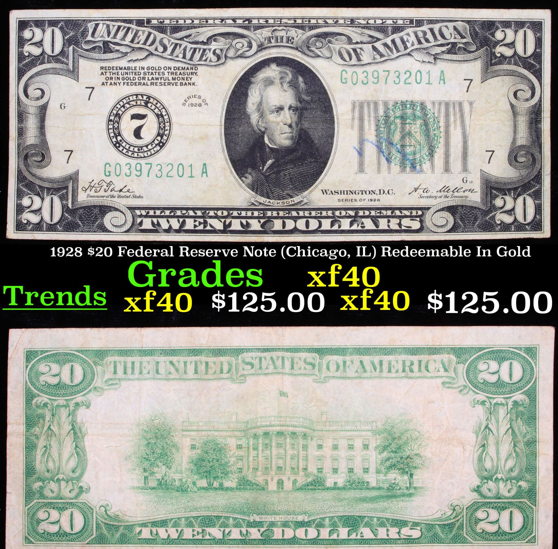 1928 $20 Federal Reserve Note (Chicago, IL) Redeemable In Gold Grades xf.