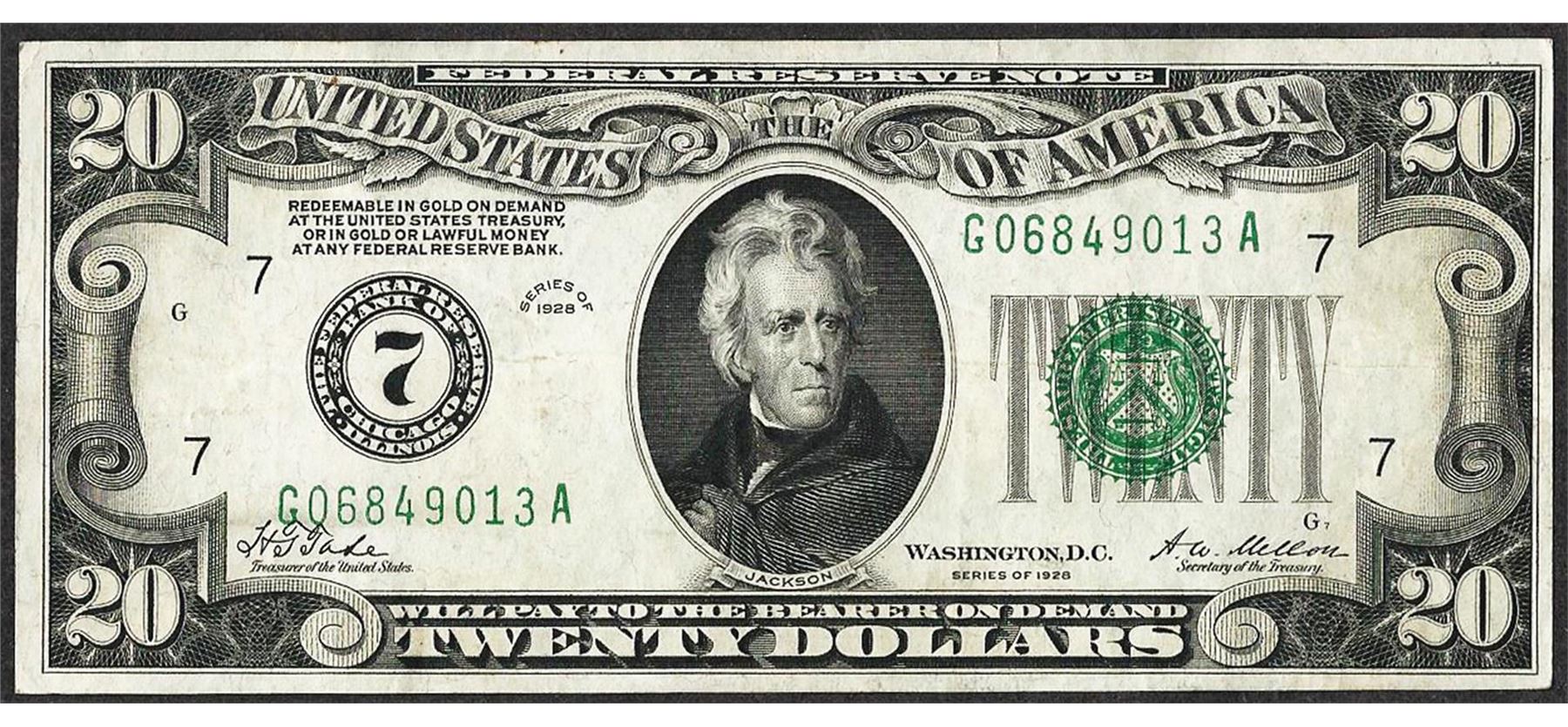 One 1928 $20 Federal Reserve Note Chicago - Redeemable in Gold.