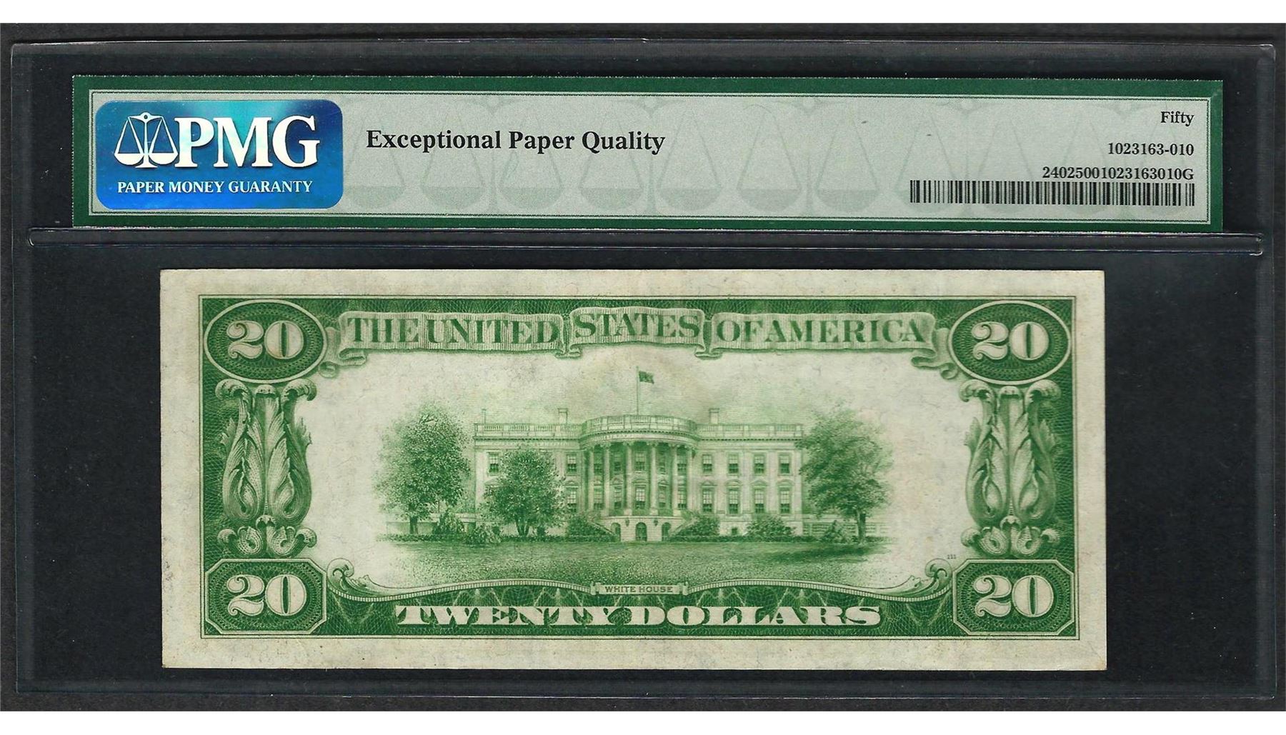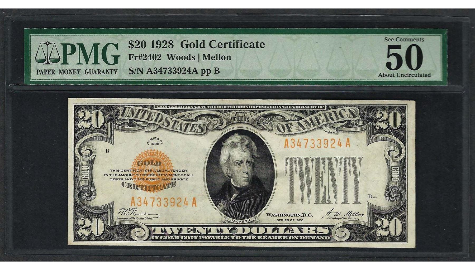 One 1928 $20 Gold Certificate Note Fr.2402 PMG About Uncirculated 50EPQ. PMG Certified.