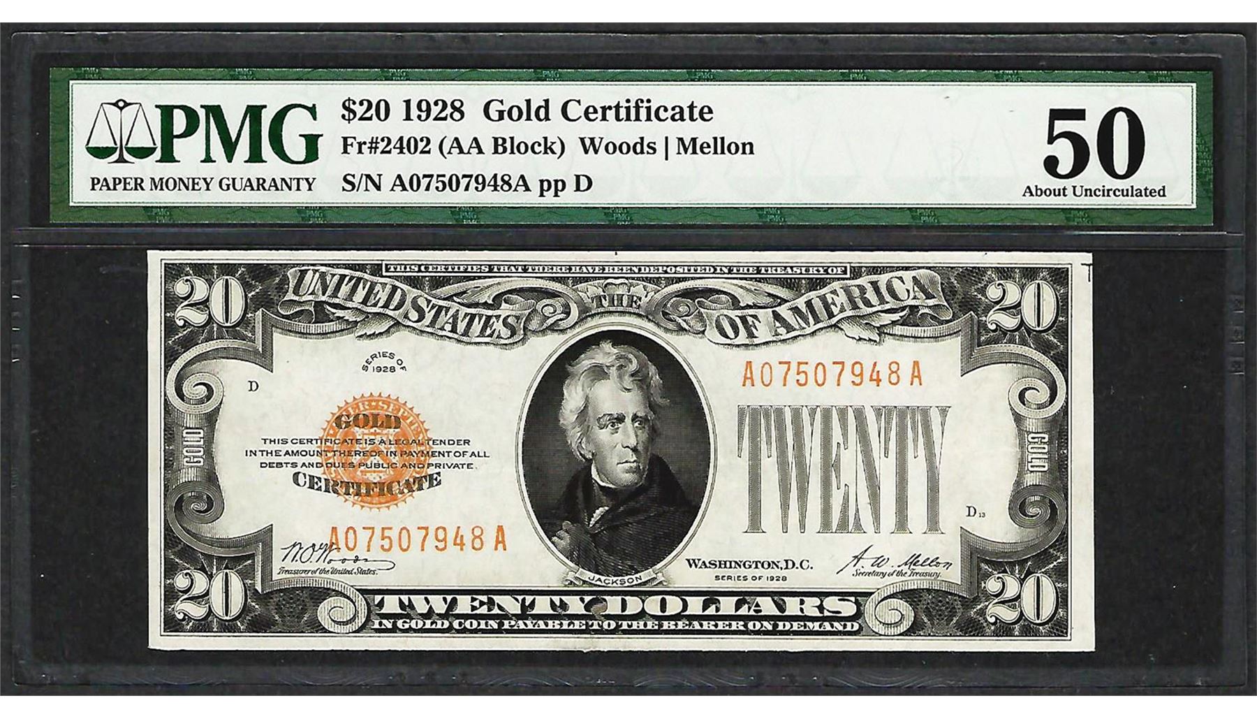 One 1928 $20 Gold Certificate Note Fr.2402 PMG About Uncirculated 50. PMG Certified.