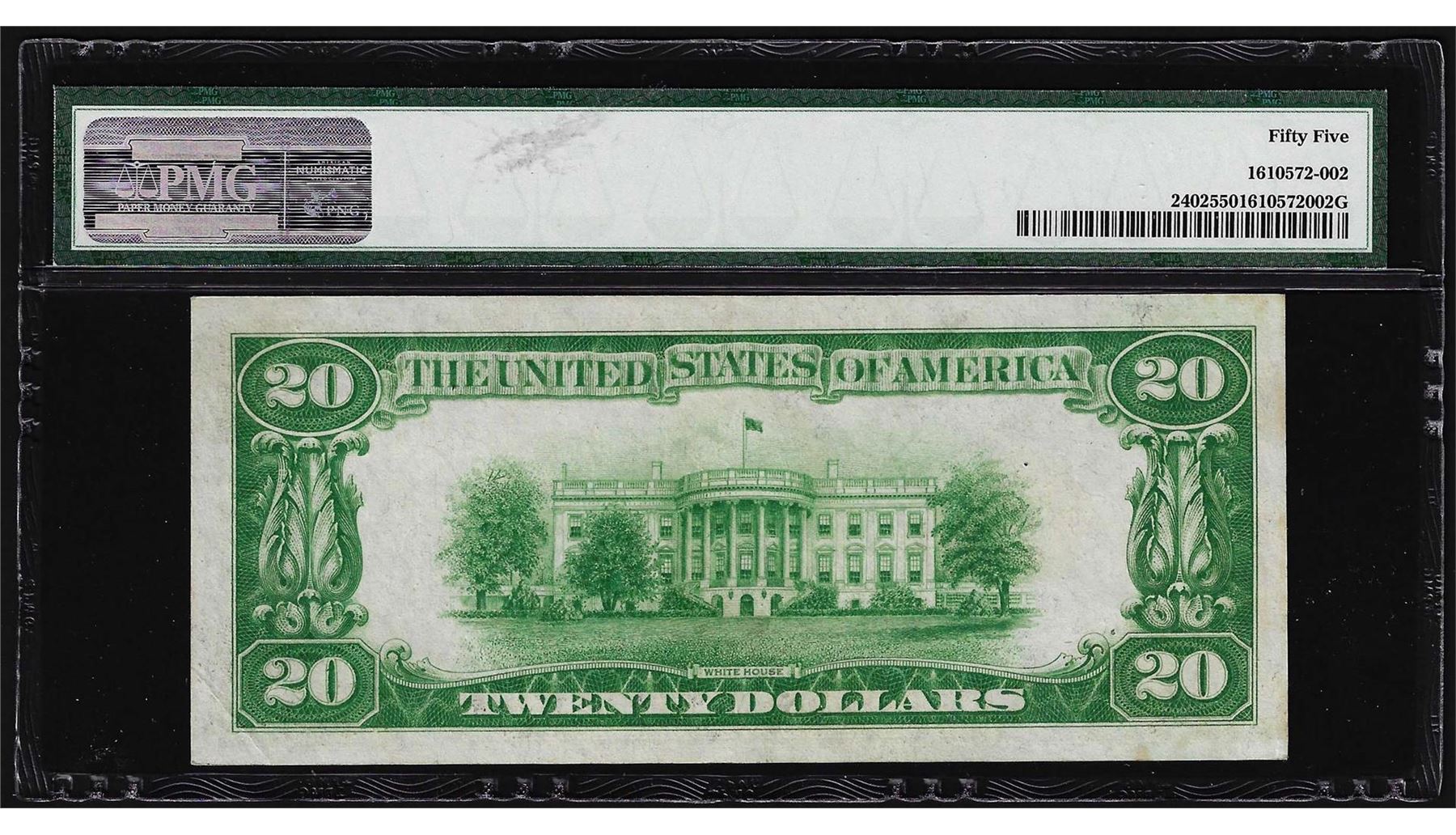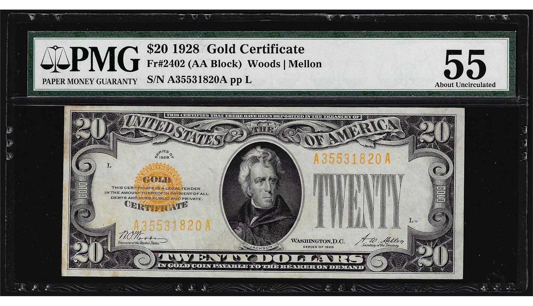 One 1928 $20 Gold Certificate Note Fr.2402 PMG About Uncirculated 55. PMG Certified.