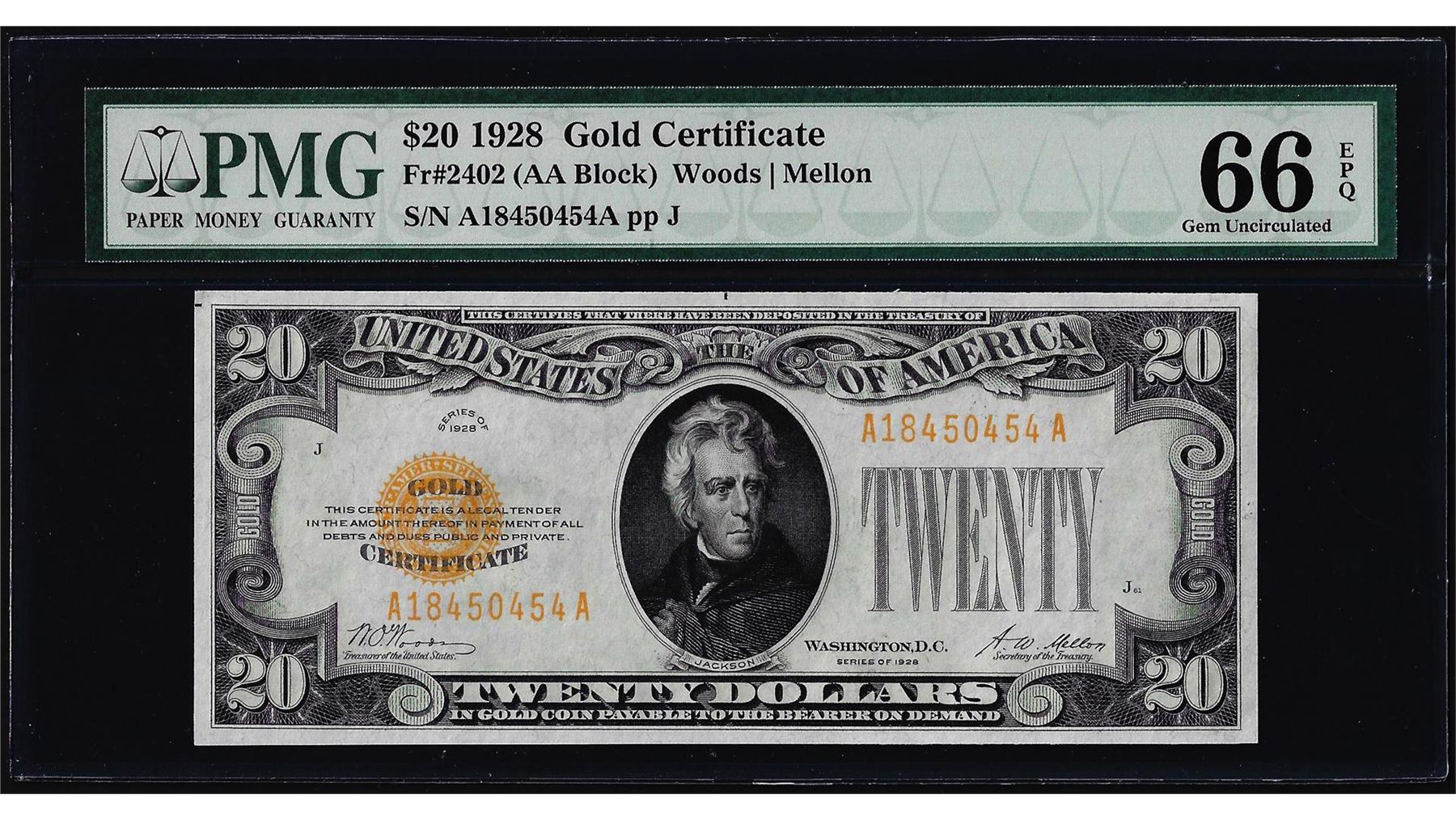 One 1928 $20 Gold Certificate Note Fr.2402 PMG Gem Uncirculated 66EPQ. PMG Certified.