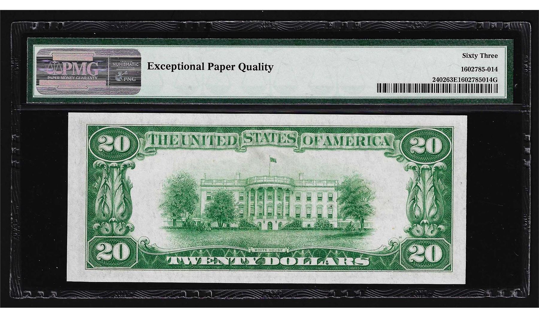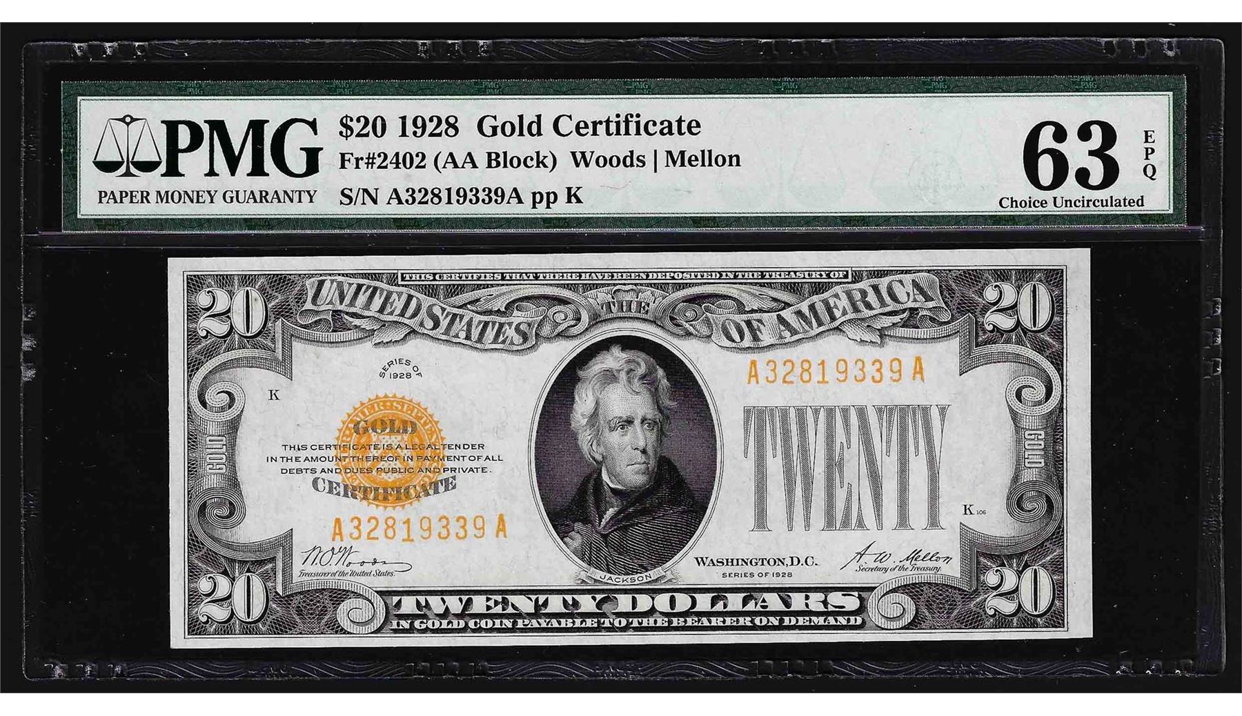 One 1928 $20 Gold Certificate Note PMG Choice Uncirculated 63EPQ. PMG Certified.