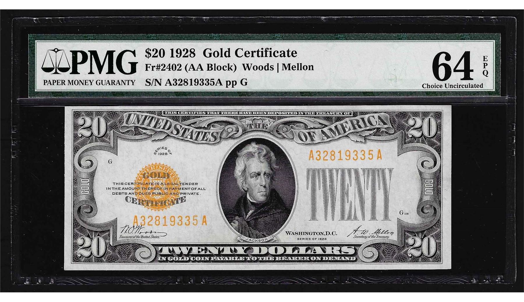 One 1928 $20 Gold Certificate Note PMG Choice Uncirculated 64EPQ. PMG Certified.