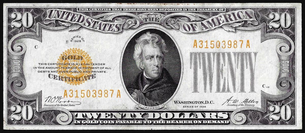 One 1928 $20 Gold Certificate Note.
