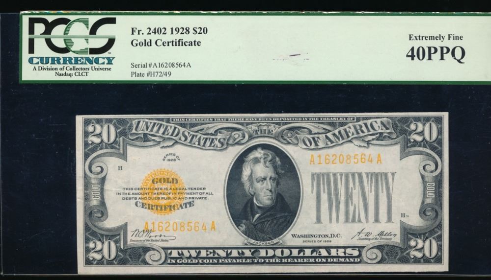 One 1928 $20 Gold Certificate PCGS 40PPQ.