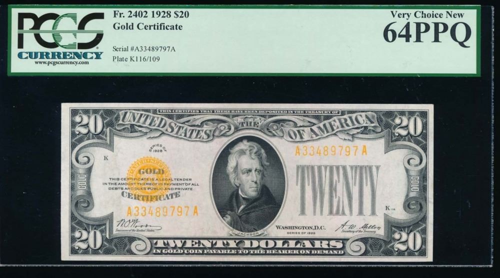 One 1928 $20 Gold Certificate PCGS 64PPQ.