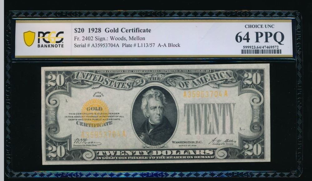 One 1928 $20 Gold Certificate PCGS 64PPQ.