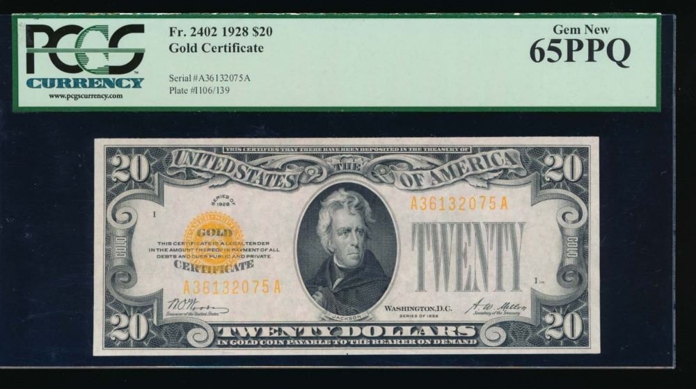 One 1928 $20 Gold Certificate PCGS 65PPQ.