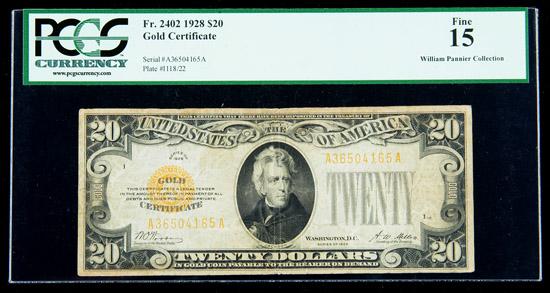 1928, $20 Gold Certificate. PCGS Fine 15. . Fr-2402. An affordable certified small size Gold Certificate.