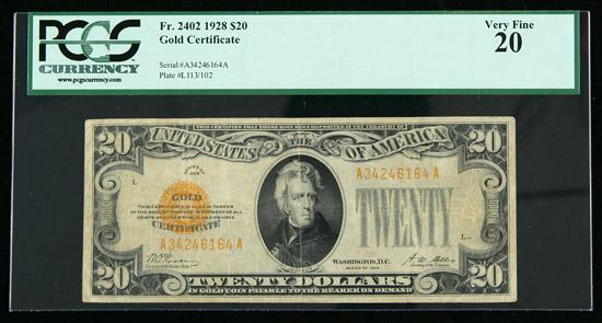 1928, $20 Gold Certificate. PCGS Very Fine 20. . Fr-2402. A circulated example of this popular Gold seal note.