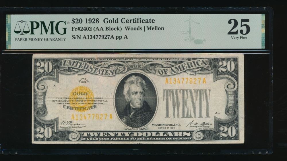 One 1928 $20 Gold Certificate PMG 25.