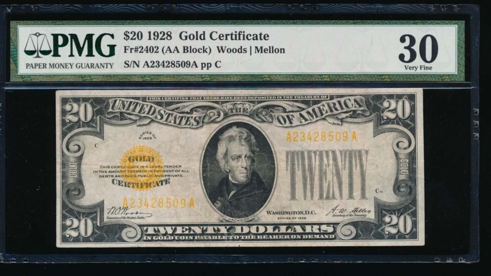 One 1928 $20 Gold Certificate PMG 30.