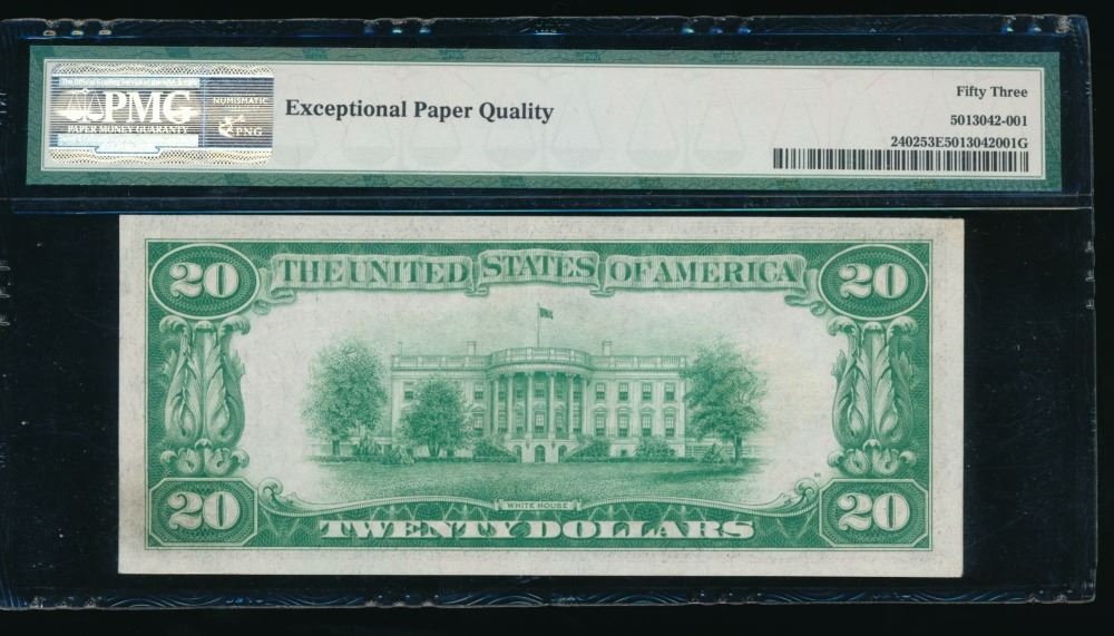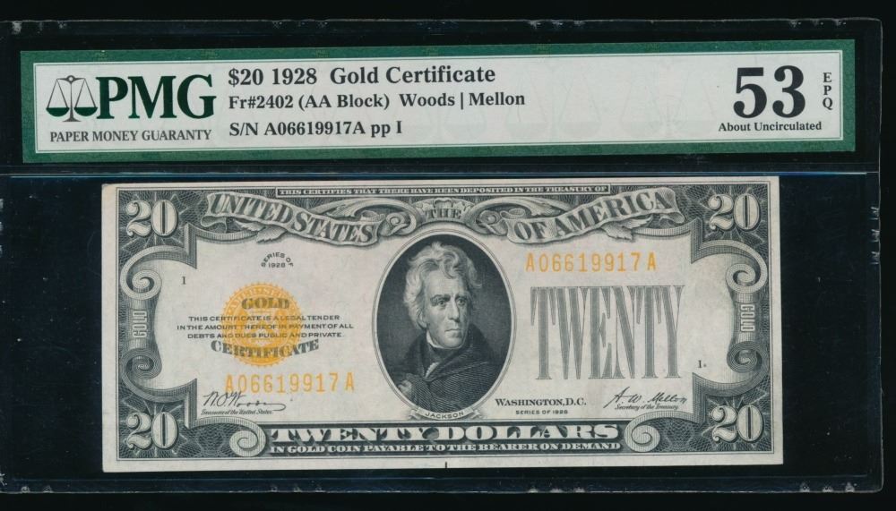 One 1928 $20 Gold Certificate PMG 53EPQ.