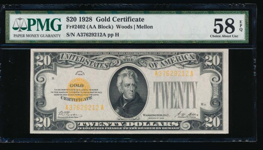 One 1928 $20 Gold Certificate PMG 58EPQ.