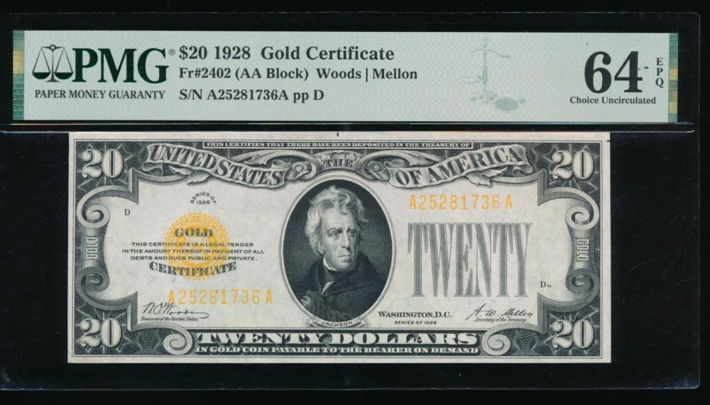 One 1928 $20 Gold Certificate PMG 64EPQ.