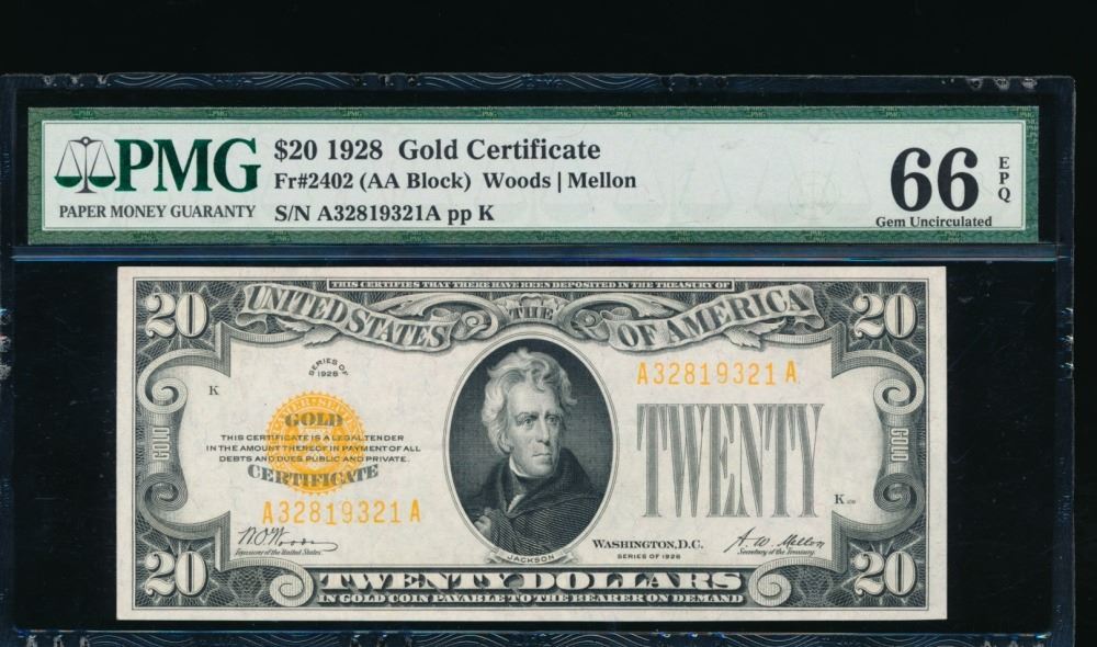 One 1928 $20 Gold Certificate PMG 66EPQ.