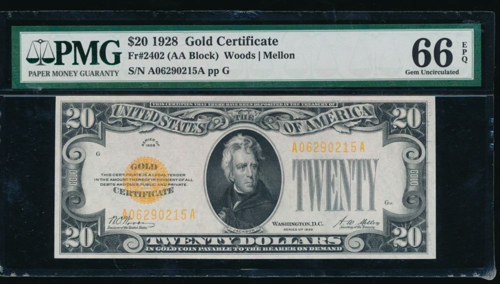 One 1928 $20 Gold Certificate PMG 66EPQ.