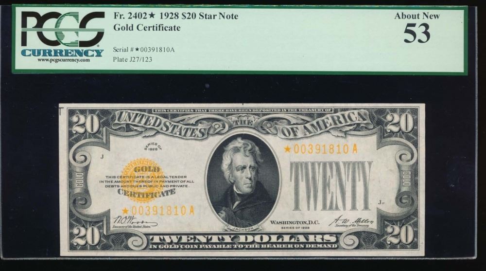 One 1928 $20 Gold Certificate Star Note PCGS 53.