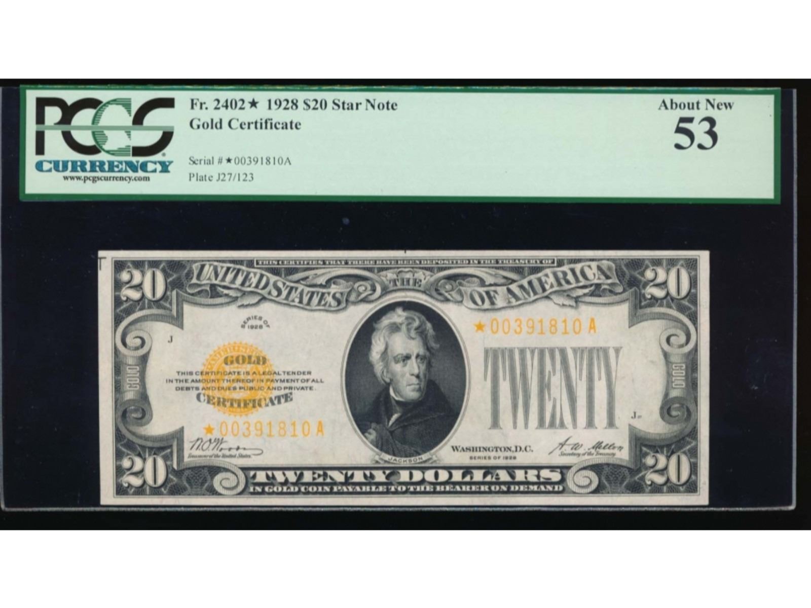One 1928 $20 Gold Certificate Star Note PCGS 53.