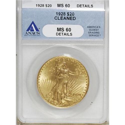 <B>1928 $20 --Cleaned--ANACS MS60 Details.</B></I> NGC Census: (174/38027). PCGS Population (384/37675). Mintage: 8,816,000. Numismedia Wsl. Price for NGC/PCGS coin in MS60: $875. (#9189)<BR><BR><B>Coin Engraver:</B> Augustus Saint-Gaudens<BR><BR><b>Shipping:</b> Coins & Currency (<a target="_blank" href="http://www.heritageauctions.com/common/shipping.php">view shipping information</a>)