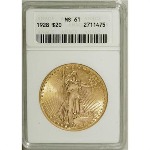 <B>1928 $20 MS61 ANACS.</B></I> NGC Census: (1419/35620). PCGS Population (1468/33992). Mintage: 8,816,000. Numismedia Wsl. Price for NGC/PCGS coin in MS61: $720. (#9189)<BR><BR><B>Coin Engraver:</B> Augustus Saint-Gaudens<BR><BR><b>Shipping:</b> Coins & Currency (<a target="_blank" href="http://www.heritageauctions.com/common/shipping.php">view shipping information</a>\)