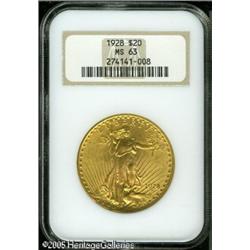 <B>1928 $20 MS63 NGC.</B></I> Sweeping cartwheel luster, a bold strike, and consistent yellow-gold color proclaim the appeal of this carefully preserved Saint-Gaudens. In an older generation NGC holder. Lot:9752