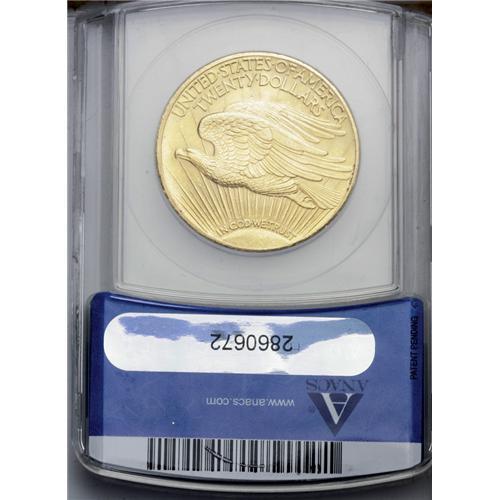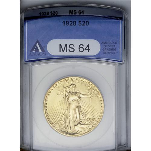 <B>1928<$20> MS64 ANACS.</B></I> A considerably better-than-average strike defines the elegant design motifs on each side of this lovely near-Gem. Satin luster illuminates rose-green toning.