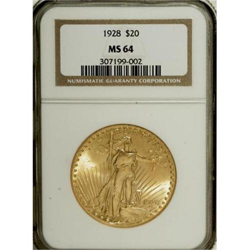 <B>1928 $20 MS64 NGC.</B></I> NGC Census: (12020/5273). PCGS Population (9657/7625). Mintage: 8,816,000. Numismedia Wsl. Price for NGC/PCGS coin in MS64: $890. (#9189)<BR><BR><b>Shipping:</b> Coins & Currency (<a target="_blank" href="http://www.heritageauctions.com/common/shipping.php">view shipping information</a>)