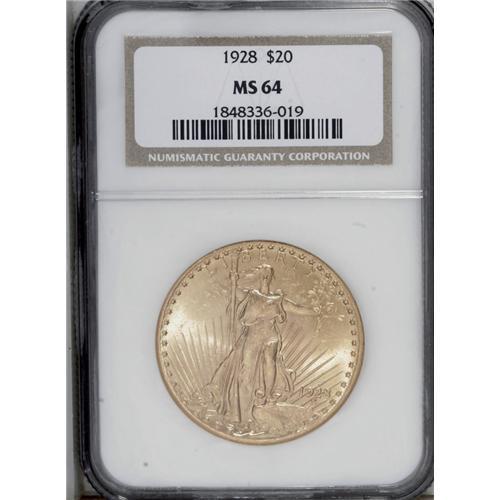 <B>1928<$20> MS64 NGC.</B></I> The vivid yellow-gold surfaces have strong luster, and the devices are well-defined. Minor marks appear on each side, and abrasions are noted on Liberty's leg and in the nearby left field.