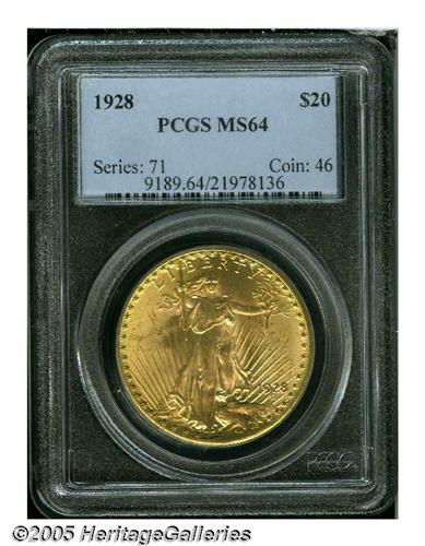 <B>1928<$20> MS64 PCGS.</B></I> Bright luster and a mild coating of mint frost over both sides gives the piece a visually pleasing sheen. The coin is lightly toned and seems minimally abraded, for a near-Gem.