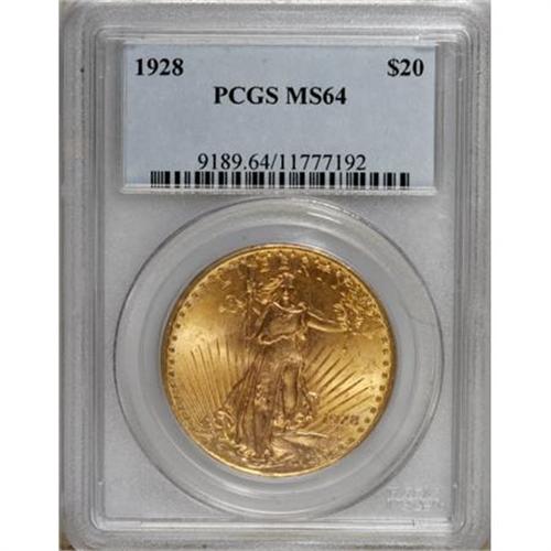 <B>1928 $20 MS64 PCGS.</B></I> PCGS Population (10008/8086). NGC Census: (12109/5359). Mintage: 8,816,000. Numismedia Wsl. Price for NGC/PCGS coin in MS64: $840. (#9189)<BR><BR><B>Coin Engraver:</B> Augustus Saint-Gaudens<BR><BR><b>Shipping:</b> Coins & Currency (<a target="_blank" href="http://www.heritageauctions.com/common/shipping.php">view shipping information</a>)