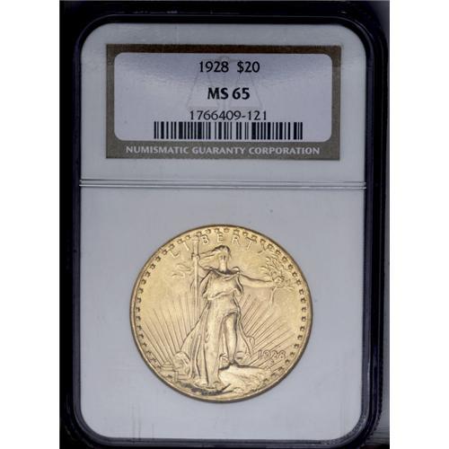 <B>1928<$20> MS65 NGC.</B></I> A well-defined coin with great luster on the orange-gold surfaces. While the mintage was more than twice that of the 1927 double eagle, melting affected this issue more heavily.