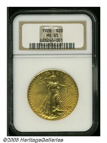 <B>1928<$20> MS65 NGC.</B></I> Attractive peach-gold surfaces display flashy luster and sharply struck design elements. There are no significant contact marks to report.