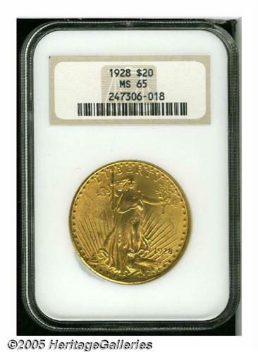 <B>1928<$20> MS65 NGC.</B></I> This splendid Gem provides bright honey color and exhibits vibrant cartwheel sheen. Nicely struck, and only the faintest grazes accompany the obverse field.