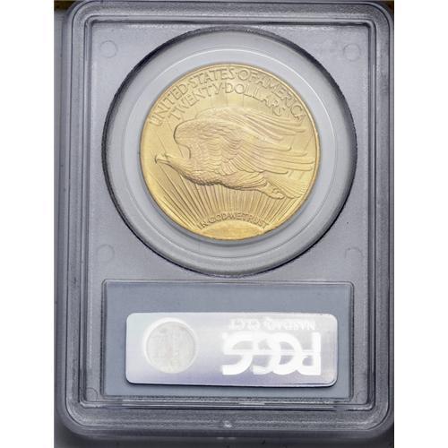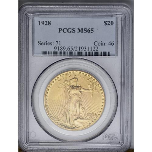 <B>1928<$20> MS65 PCGS.</B></I> The fine-grained, satiny surfaces are somewhat matte-like, with lambent luster underlying the greenish-gold surfaces. Perusal with a loupe reveals a nick through Liberty's torso and one through the eagle's breast, but elsewhere the piece is nearly abrasion-free, and the overall appearance is extremely high-end.<BR><I>From The Jackson Hole Collection.</B></I>