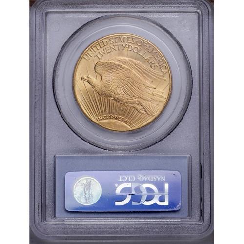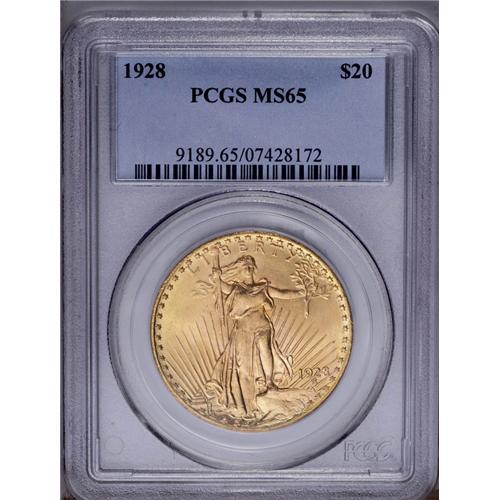 <B>1928<$20> MS65 PCGS.</B></I> Pretty lime and plum tints are especially evident along the lower right obverse rim. The strike is attentive, since only the top of the torch and Liberty's raised knee lack full detail. A smooth obverse field adds to the eye appeal.