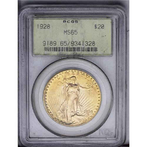 <B>1928<$20> MS65 PCGS.</B></I> Very lustrous and well struck throughout. A single abrasion is seen in the field under Liberty's right (facing) arm. <BR><BR><B>Important notice:</B> Heritage usually auctions material at the rate of 200-250 lots per hour. On some occasions eBay Live bid software or the Internet may not be able to keep up with the pace of the auction. We recommend placing a realistic absentee bid now as insurance to avoid disappointment. Occasionally the auctioneer may eliminate or reject an eBay Live bid, and the auctioneer may also reopen a lot after the close of the eBay live bidding (usually because we missed an audience bid), and may reject your bid even if it shows you as the winning bidder. By bidding via eBay Live, you agree that Heritage may award the lot to another bidder at its sole discretion under the circumstances described above or any other reasonable circumstances. Since eBay bids are not shown to us until we open the lot on the floor, we treat those bids just like floor bids. In most cases the floor responds before the eBay bid is presented to us, due to Internet lag time, so for consistency we have made it a policy that floor bids are always considered first over tie eBay live bids. Also please note that all Heritage lots purchased through eBay Live carry a 20% Buyer's Premium. Please make sure you read the Terms and Conditions before you bid. This lot is being auctioned in conjunction with a live floor auction by Heritage Galleries & Auctioneers. All final auction and invoice information will be supplied by Heritage Galleries & Auctioneers, and all other information should be considered preliminary. Lot:4746 <BR><BR><B>Winning Notification and Billing:</B> After the FINAL session in this auction is complete, Heritage will send e-mail and snail mail invoices. This process normally takes several days. All final auction and invoice information will be supplied by Heritage Galleries & Auctioneers, and all other information should be considered preliminary. <BR><BR>This auction will be conducted on a live auction floor and over the Internet through eBay Live. If you choose to place an absentee bid, please take a moment to <font color='#0000ff'><u><a href='http://pages.ebay.com/liveauctions/help/before/laabsentee.html'>learn how eBay Live absentee bidding works</a></u></font><font color='#000000'>