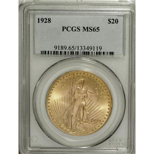 <B>1928 $20 MS65 PCGS.</B></I> PCGS Population (6091/2388). NGC Census: (4297/1188). Mintage: 8,816,000. Numismedia Wsl. Price for NGC/PCGS coin in MS65: $1,220. (#9189)<BR><BR><B>Coin Engraver:</B> Augustus Saint-Gaudens<BR><BR><b>Shipping:</b> Coins & Currency (<a target="_blank" href="http://www.heritageauctions.com/common/shipping.php">view shipping information</a>)