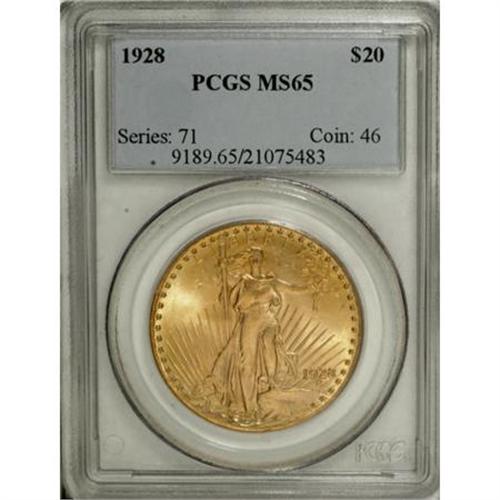 <B>1928 $20 MS65 PCGS.</B></I> Swirling luster and subtle straw-gold accents grace the vivid butter-yellow surfaces. Boldly impressed devices are pleasingly preserved. An attractive example of the last generally affordable double eagle issue.<BR><BR><B>Coin Engraver:</B> Augustus Saint-Gaudens<BR><BR><b>Shipping:</b> Coins & Currency (<a target="_blank" href="http://www.heritageauctions.com/common/shipping.php">view shipping information</a>)