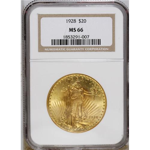 <B>1928 $20 MS66 NGC.</B></I> A medley of orange, yellow, and greenish-gold embraces highly lustrous surfaces. Powerfully struck and minimally abraded.<BR><BR><b>Shipping:</b> Coin/Currency (<a target="_blank" href="http://www.heritageauctions.com/common/shipping.php">view shipping information</a>)