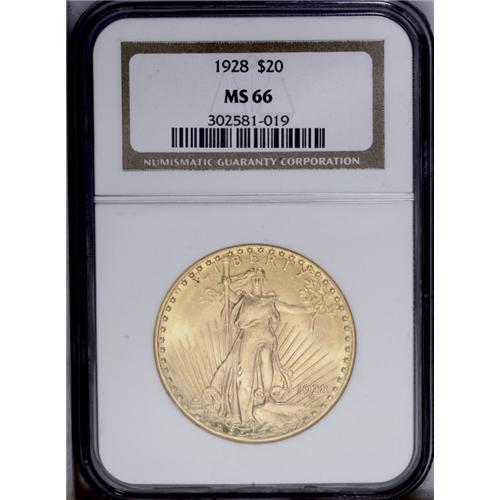 <B>1928 $20 MS66 NGC.</B></I> The bright, glittering golden surfaces show the usual thick mint luster this issue is so well known for, and each side is nearly abrasion-free.