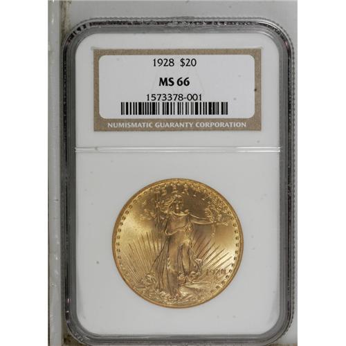 <B>1928 $20 MS66 NGC.</B></I> This is a Premium Gem of breathtaking beauty, produced by a combination of bold design details, intense shimmering luster, and variegated orange-gold, peach, and mint-green toning. Some tiny marks on the lower reverse field and a couple of minor abrasions just above Liberty's left (facing) knee preclude an even loftier grade designation.<BR><BR><b>Shipping:</b> Coins & Currency (<a target="_blank" href="http://www.heritageauctions.com/common/shipping.php">view shipping information</a>)