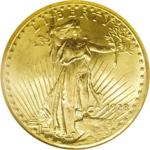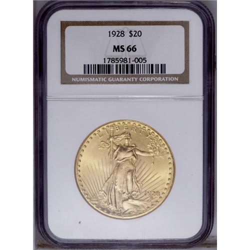 <B>1928<$20> MS66 NGC.</B></I> This is a gorgeous Gem and is one of the finer examples of this date available to collectors. The surfaces are frosty and lustrous with splendid, bright green-gold color.