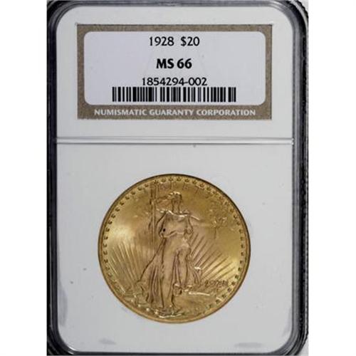 <B>1928 $20 MS66 NGC.</B></I> Mint-green and peach coloration attractively adorns each side of this well struck, highly lustrous Premium Gem. Surface blemishes are nearly nonexistent. A small, dark reddish-brown spot is noted beneath Liberty's left (facing) breast. <BR><BR><B>Coin Engraver:</B> Augustus Saint-Gaudens<BR><BR><b>Shipping:</b> Coins & Currency (<a target="_blank" href="http://www.heritageauctions.com/common/shipping.php">view shipping information</a>)